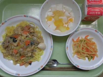 五目あんかけ焼きそば、牛乳、じゃがいものバンサンスー、フルーツミルク寒天です。