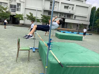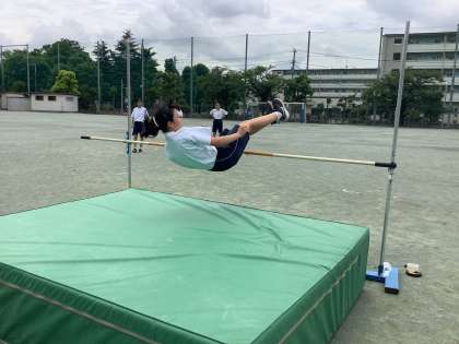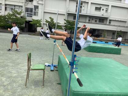 3年生の保健体育では走り高跳びを学習しています。今日は初めて背面跳びに挑戦です。椅子を使って練習をしてから、椅子なしで3歩助走での背面跳びを行いました。3年生は都合4回の走り高跳びの授業で、15センチも記録を伸ばした生徒もいました。よく頑張りました!