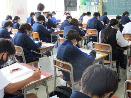 期末考査2日目は、国語、社会、技術家庭の3教科の実施です。写真は2年生が真剣に取り組んでいる一コマ。物音を立てられない緊張感がありました。本校では今年度職員間で「良問」を目指すことを確認しています。良問の条件の一つとして、テスト問題のねらいと授業のねらいが一致していることを大切にしています。明日は最終日。頑張れ、喜多見中生!!