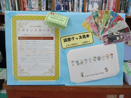 期末考査が終了し、昨日から図書館では「ポイントカード制」の利用促進キャンペーンが展開されています。来館や貸出しの度にポイントを貯めると、図書委員会特製のブックカバーやしおりのプレゼントが貰えるというもの。司書さんに取材をすると、『今日の昼も満席。火曜の昼休み時点で、先週の3倍の貸し出しがあります!』とのこと。素敵な本にたくさん出会えるといいですね。