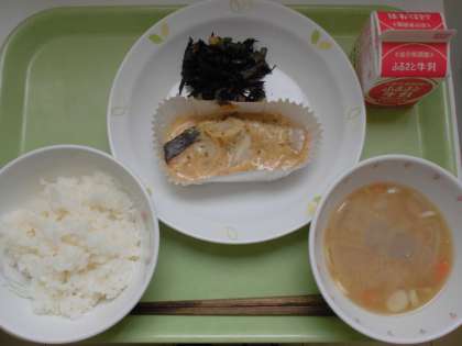 ごはん、牛乳、利休汁、鮭のみそマヨネーズ焼き、ひじきの五目煮です。