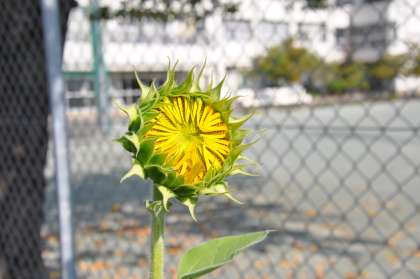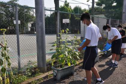 7月9日に種を撒いたひまわりが咲き始めました。元気に挨拶を交わす水やりのボランティアの生徒たちも少し誇らしげ。プランターは先週から街道沿いに戻され、間もなく一斉に咲く姿を道行く人々にお届けできそうです。