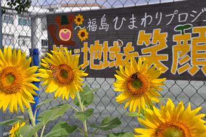 沿道のひまわりが見ごろを迎えています。久しぶりの陽光を浴びたひまわりたちが、たくさんの蜂や蝶を集めていました。間引かれ、路地植えの子たちもたくましく咲いています!