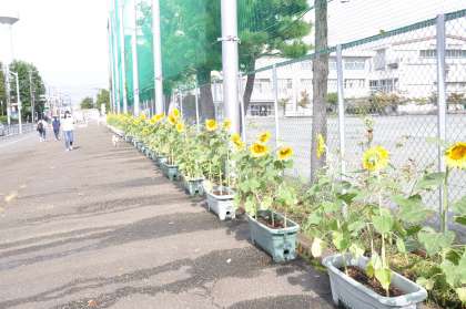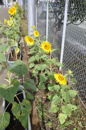 分散登校3日目 — ひまわりたちも学校の「潤い」に貢献しています。