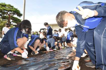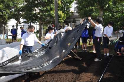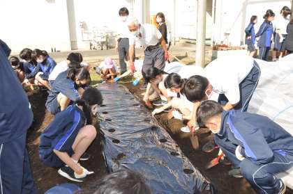 今日の1年生の6時間目は、出席番号後半組による「大蔵大根づくり」の実習でした。先週末は、前半組が楽しそうに実習する様子をオンラインで視聴していたので今日の日を楽しみにしていました。