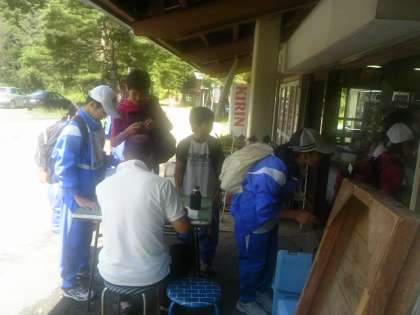 オリエンテーリングの折り返し点に到着です。班毎にチェックを受けています。