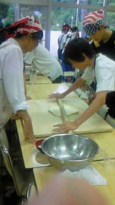 棒でのばす作業に入りました。さあて、美味しいうどんができるでしょうか?