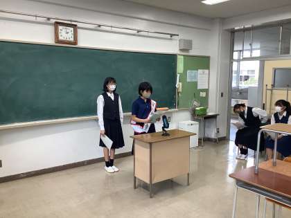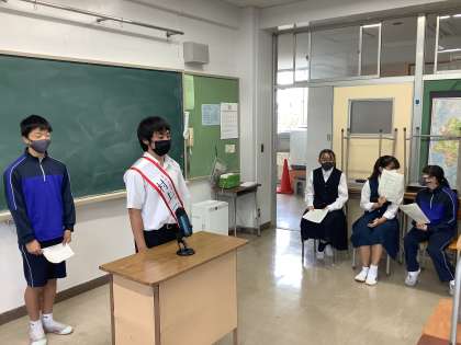 30日(金)の役員選挙に向け、リハーサルを行いました!リハーサルとはいえ、本番同様の緊張感で臨んでいました。リハーサル終了後には、第40期生徒会本部役員から「目線はカメラにしっかり向ける」、「自分が思っている以上にゆっくり話す」、「隣のクラスからのスピーカーの音で自分の声が聞こえなくなるので気をつけて」など、演説のポイントのレクチャーがありました。役員選挙に向けて、魂をこめて頑張る様子がとても立派でした!