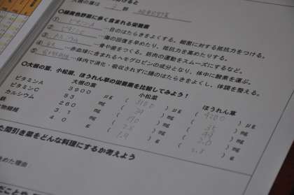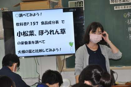 栄養教諭が在籍するメリットを活かし、6校時には1年生を対象とした食育の授業がありました。目下すくすくと学校菜園で成長する大蔵大根も、そろそろ「間引き」の時期。さて、間引いた大根の葉はどうするべきでしょう。農家の方に取材をすると、日持ちのする保存食としての「塩漬け」や、束にして販売もされている様子。調べてみると、栄養価は非常に高いことが分かりました。