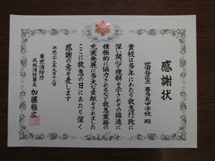 本校では毎年3年生が救急救命の講習を受講しています。また、先日はPTA活動として取り組みました。その継続的な活動に対して、東京消防庁より表彰していただきました。ありがとうございました。