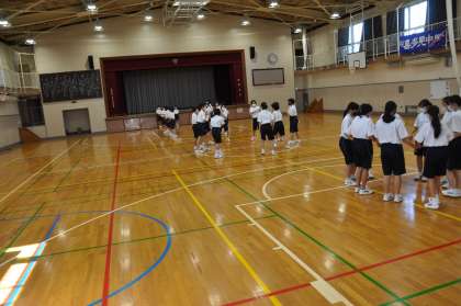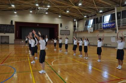 女子の保健体育におけるダンス教育では、「創作ダンス」「フォークダンス」のうち、1つ以上の内容を教えます。本校では、「現代的なリズムのダンス」が選択されています。写真は1年生の模様。軽快な曲に合わせ踊る姿は、1年生らしく、伸び伸びとして楽しそう。上手い下手にとらわれず生徒がお互いのよさを認め合える雰囲気が印象的です。