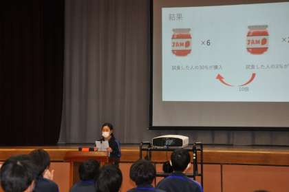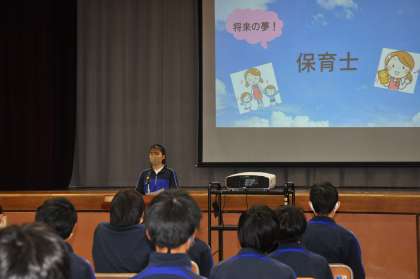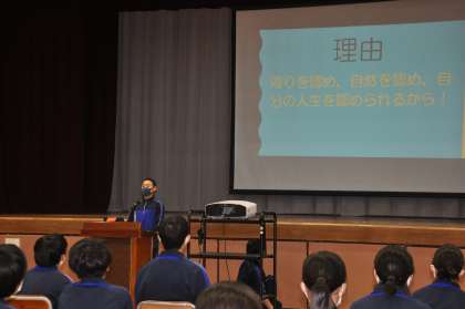 6校時には体育館で2年生が集まり、「キャリアを考える3日間」の代表発表会を実施しました。本会には、9名の代表生徒が「理想の自分」や「将来の夢」などについて、先の3日間の集中授業から学んだことや感じたこと等をパワーポイントを駆使しながら、各自が自分の言葉で表現しました。当日にご協力いただいた地域の方々も参観される中、素晴らしいプレゼンテーションとなりました。