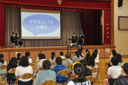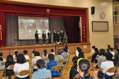 本日、コロナ禍の影響により9月から延期した「新入生部活動体験・学校紹介」を実施しました。生徒会本部による楽しい「学校紹介ニュース」ですっかり打ち解けた雰囲気のまま、それぞれお待ちかねの部活動体験へ。シュートやスマッシュが決まって拍手、きれいな音が出てグータッチなど、可愛い後輩に優しく指導する先輩の姿がありました。