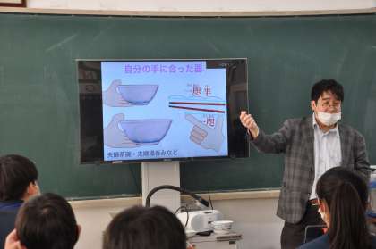 9日(木)は、(株)三信化工より海老原様をお招きし、「和食文化」の講義がありました。食を通じ人を大切にする思いや和食器の奥深さなどについて、映像を交えながら分かりやすいお話をいただいています。本講座は、2,3年生の各学級で順次展開される予定です。