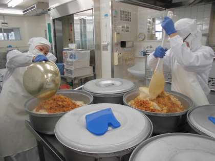 大きな炊飯釜で、ムラがなくなるまでしっかりと混ぜます!