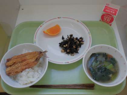 今日の給食は「ヤイカガシ」に使われるいわしを使ったかば焼き丼、