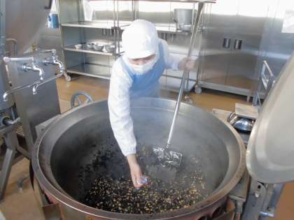 ひじきと大豆の炒め煮の最終確認。温度が75度以上になっているか確認しています。