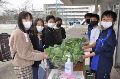 喜多見小学校6年生が手塩にかけて育てた小松菜が届けられました。昨年末には本校1年生が栽培して収穫した大蔵大根を喜多見小に届けましたが、そのお返し。早速、本日の給食に振舞われる予定です。喜多見小のみなさん、ごちそうさまです!