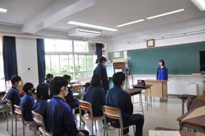 今週は生徒会朝礼からのスタートです。会長から、「より良い学校づくりに向けて、意見を発信することが大切です。」という、力強い言葉がありました。その後、前期専門員長等への任命が行われ、各委員長からの意気込みが各学級に届けられました。