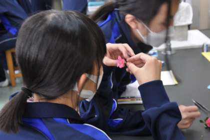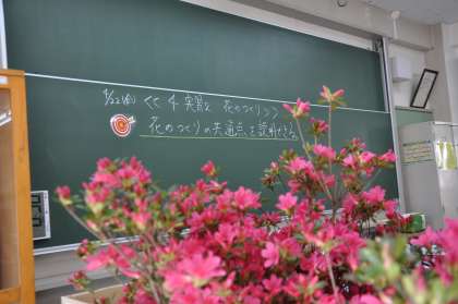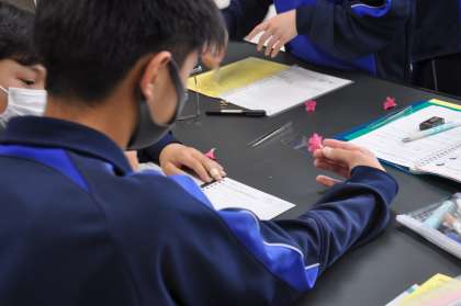 5校時の理科室では、1年生が実験を行っていました。黒板には「花の作りの共通点を説明できる」と、「めあて」が明示されています。ツツジの花を分解し、花の作りを調べます。『授業の最後に、隣の人同士で説明をしてもらうよ!』と、こちらも明確な指示。楽しくて、メリハリのある授業が展開されていました。
