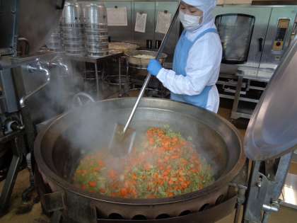 回転釜でカレーライスを作っています。