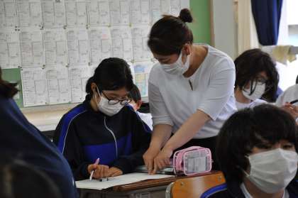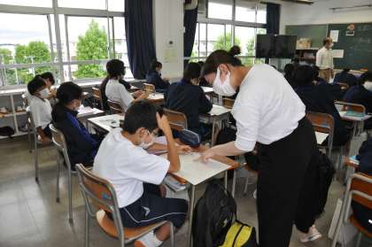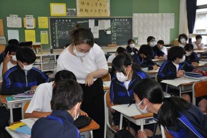 喜多見小学校から井上先生をお招きし、喜多見中学校の一日を体験していただきました。3月までお世話になった子も多い1年生は大喜び。数学の難問に苦戦しても、『井上先生、教えて!』とHELP。久しぶりに甘える姿が微笑ましいです。