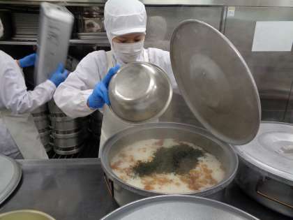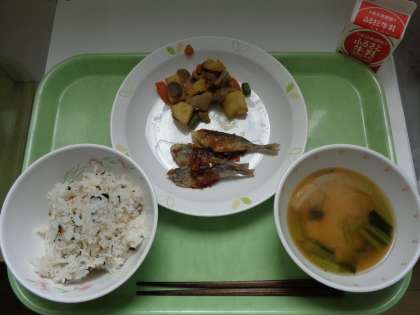 今日の給食は梅干しと炊き込みわかめを混ぜ合わせた「梅わかごはん」にしました。
