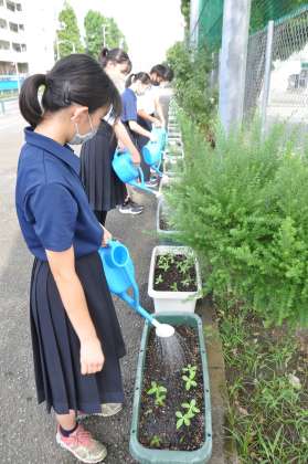 今年度の「福島ひまわりプロジェクト」は既に始まっています。写真は、今日の水やりの様子です。一般生徒の水やりボランティアは明日から。終業式当日の今朝は、生徒会本部役員が率先して水をやっていました。