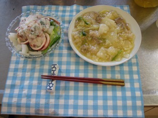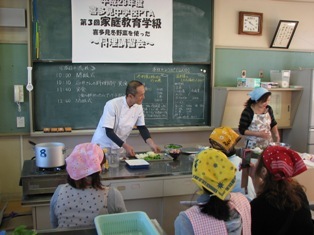 地域の専門家をお招きして指導していただき、地場産の冬野菜を使った調理実習と試食会を行いました。メニューは「冬野菜と豚肉の炒め煮」「温野菜のとろろ梅肉ソースかけ」です。やさいをたっぷり使った体にやさしく、心身ともに温まる講習会でした。