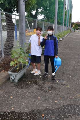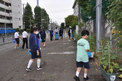 猛暑や激しい雨のためか、今年のひまわりは例年ほど背が延びません。それでも、力強く蕾を膨らませ、間もなく開花しようとしています。今朝もたくさんの生徒が水やりボランティアに参加しました。