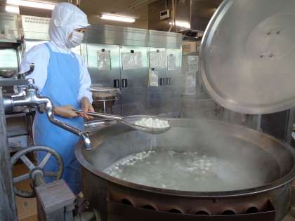 今日の給食は月見だんごに見立てた白玉を入れた「月見汁」と里芋を使った「里芋の揚げ煮」にしました。