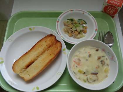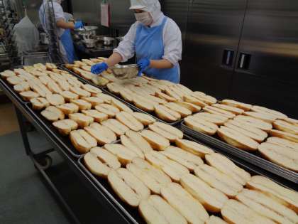 ソフトフランスパンを半分に切り、その上に手作りのガーリックバターを塗ってからオーブンで焼いていきます。