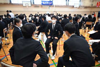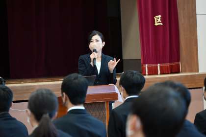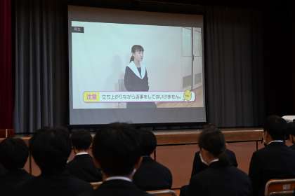 3年生の5,6校時は体育館にて「高校受験面接のためのマナー講座」を行いました。講師は本校英語講師で、元ANA客室乗務員の田部先生。面接とは何か、好感のもたれる立ち居振る舞い、受け答えの極意等々、実践的な指導を受けました。田部先生の一言ひとことに対し、子どもたちが真剣な表情でうなづいたり、メモを取ったりしていた姿が印象的でした。
