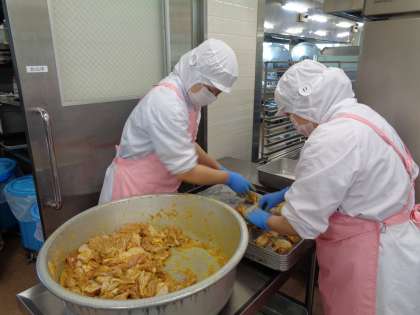 大きなタライで下味をつけ、1枚ずつ皮目が上になるように並べていきます。