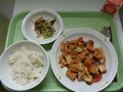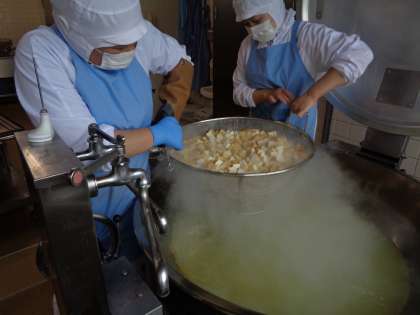 家常豆腐に入れる厚揚げはくずれやすいので、別の釜でゆでてから他の材料と合わせます。