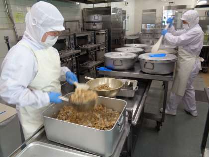 手前では里芋と他の材料を合わせて作った具を計量しています。