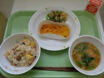 今日の給食の吹き寄せごはんの「吹き寄せ」とは主に秋〜冬に提供される献立の1種で、煮物や揚げ物、焼き物などを彩りよく盛り合わせた料理につけられる名前です。