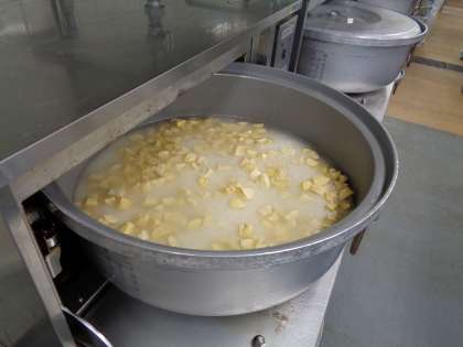その他の具は回転釜で調味料と一緒に煮て、ごはんが炊けたら混ぜ合わせます。