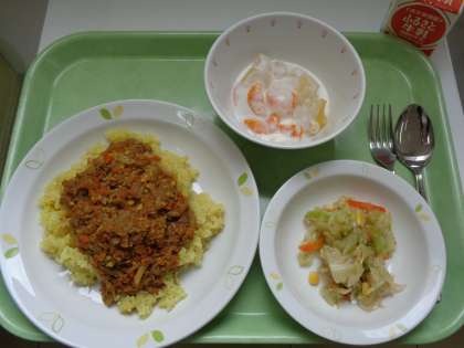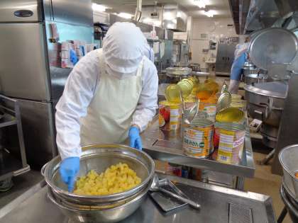 フルーツヨーグルトに使うフルーツ缶をあけています。