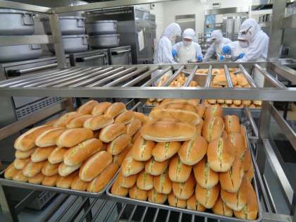 キャベツをはさまれたパンが次の工程まで待機しています。