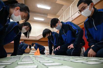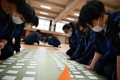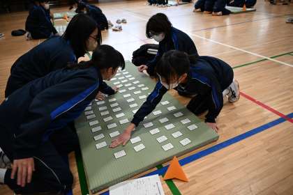 3年ぶりに「百人一首大会」を開きました。写真は、5校時の1年生と6校時の2年生の模様。会場となった格技室は、緊張と緩和を繰り返す楽しい雰囲気に溢れていました!