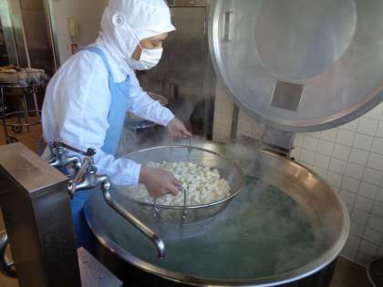 今日は2校分で174Kgの豆腐を7回に分けて下ゆでしました。
