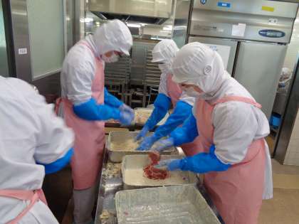 カツの衣つけをしています。