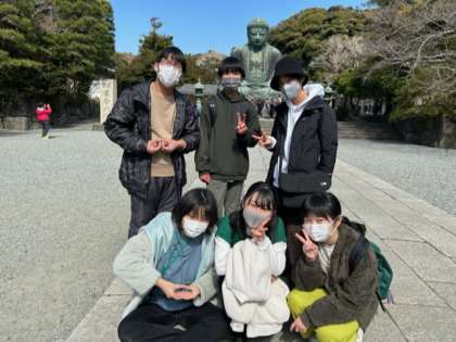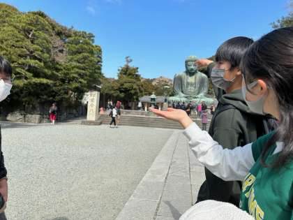 青空になり太陽の日差しも暖かいです。大仏と一緒に記念撮影です。
