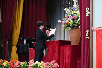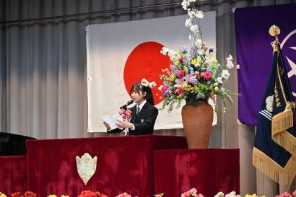 希望に満ちた135名の新入生を迎え、第43回入学式を行いました。上級生を代表して生徒会副会長からは、「少しずつコロナ禍での制限が少なくなってきていますが、前と同じように戻る必要はない、前よりもっと良くなればいい。(中略)私たちと一緒に自分の良さを活かし協力しながら、充実した学校生活を送りましょう」と、熱い歓迎の言葉が贈られました。これを受け、新入生代表からは「失敗することを恐れずに、挑戦し続けていきたい」という強い誓いの言葉がありました。