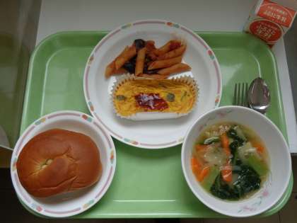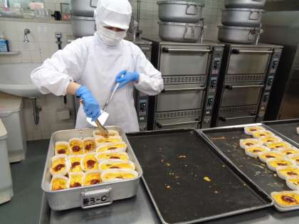 衛生的に配缶するために、給食室ではトングとフライ返しを使って