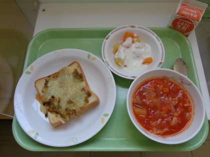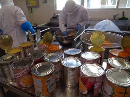 フルーツヨーグルトに使うフルーツ缶をあけています。