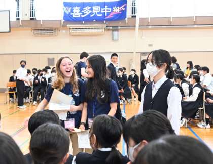 本日から18日(木)まで、アメリカ合衆国オレゴン州ポートランドから13名の8年生が喜多見中に滞在しています。工夫を凝らした2年生の温かい歓迎会は大成功。給食、授業、部活動まで、初日からすっかり打ち解けた良い雰囲気です!