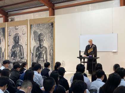 奈良に着くと雨でした。現在、薬師寺でお坊さんから有難い講話をいただいています。