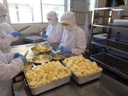 カットしたりんごは、塩水につけて茶色くならないように工夫しています。